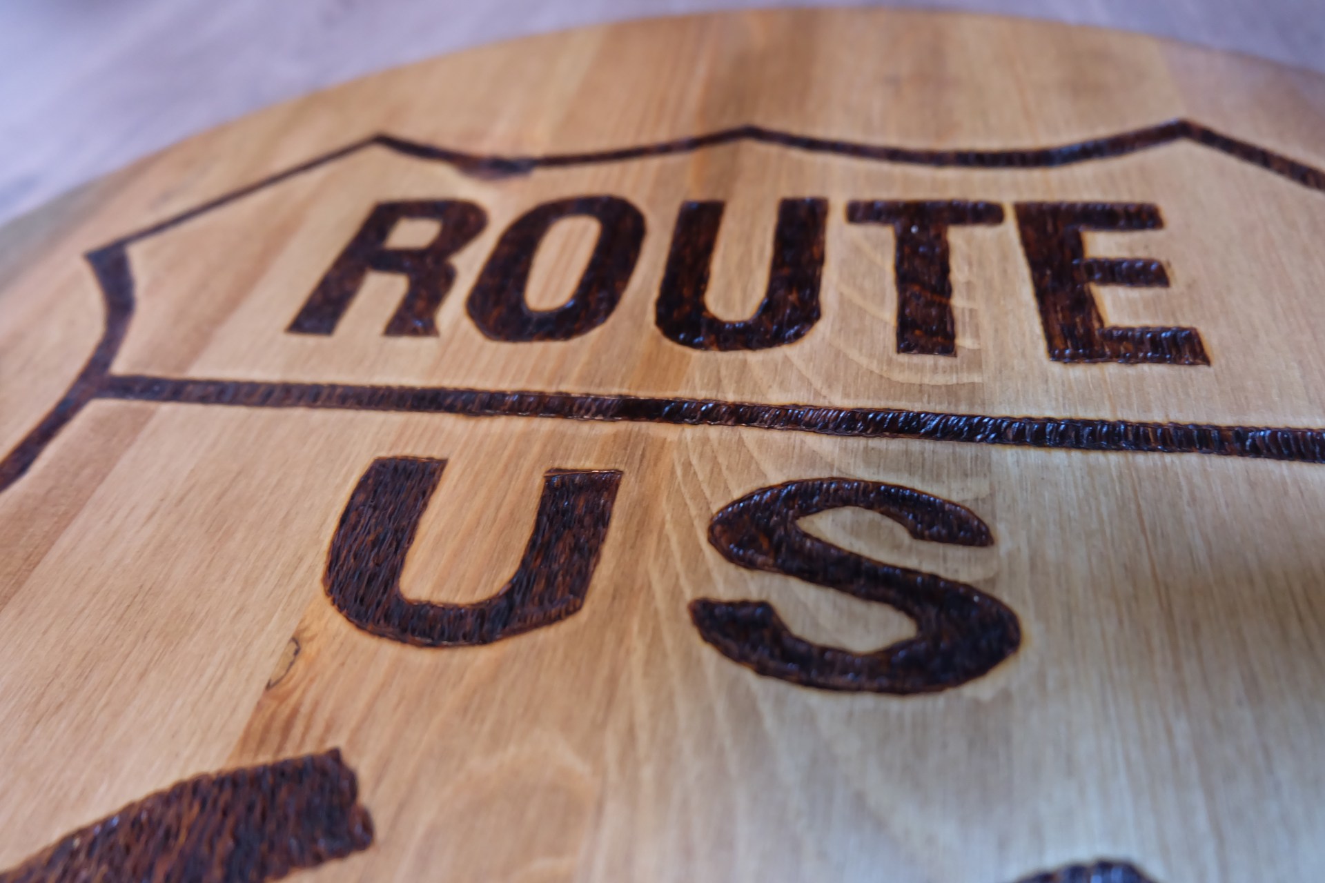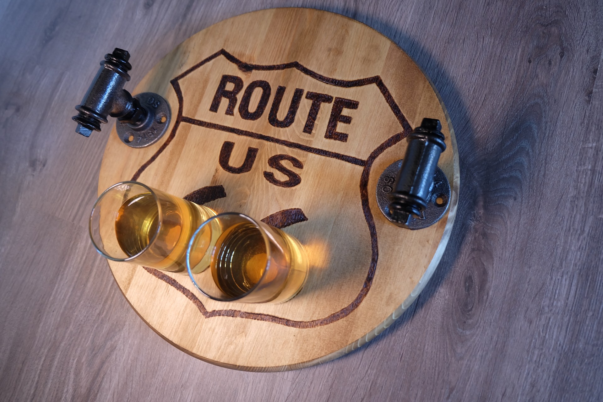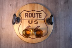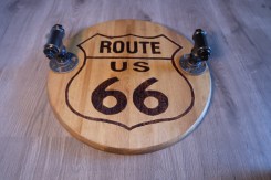 Деревянный поднос с ручками круглой формы. Ручки можно сделать другой формы по Вашему заказу. На массиве сосны выжжен рисунок для ретро декора «ROUTE 66» (Трасса 66), что очень популярно для декора в стиле Лофт. Деревянный поднос с ручками купить можно без выжженного рисунка, с другим рисунком - просто напишите или позвоните!