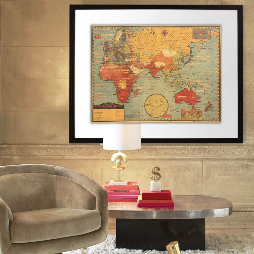 Старую карту Мира разместить на стене не сложно. Для этого выберите подходящую по стилю раму и решите, будет ли радом с ней что-то еще висеть. Если да, то картины или постеры тоже следует выбрать состаренные. Хотите сделать акцент на карте – повесьте ее по центру и в более выделяющейся раме.