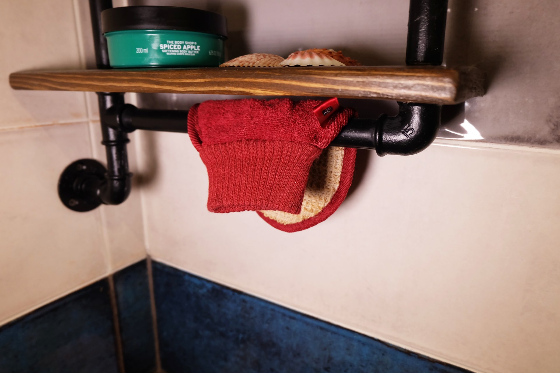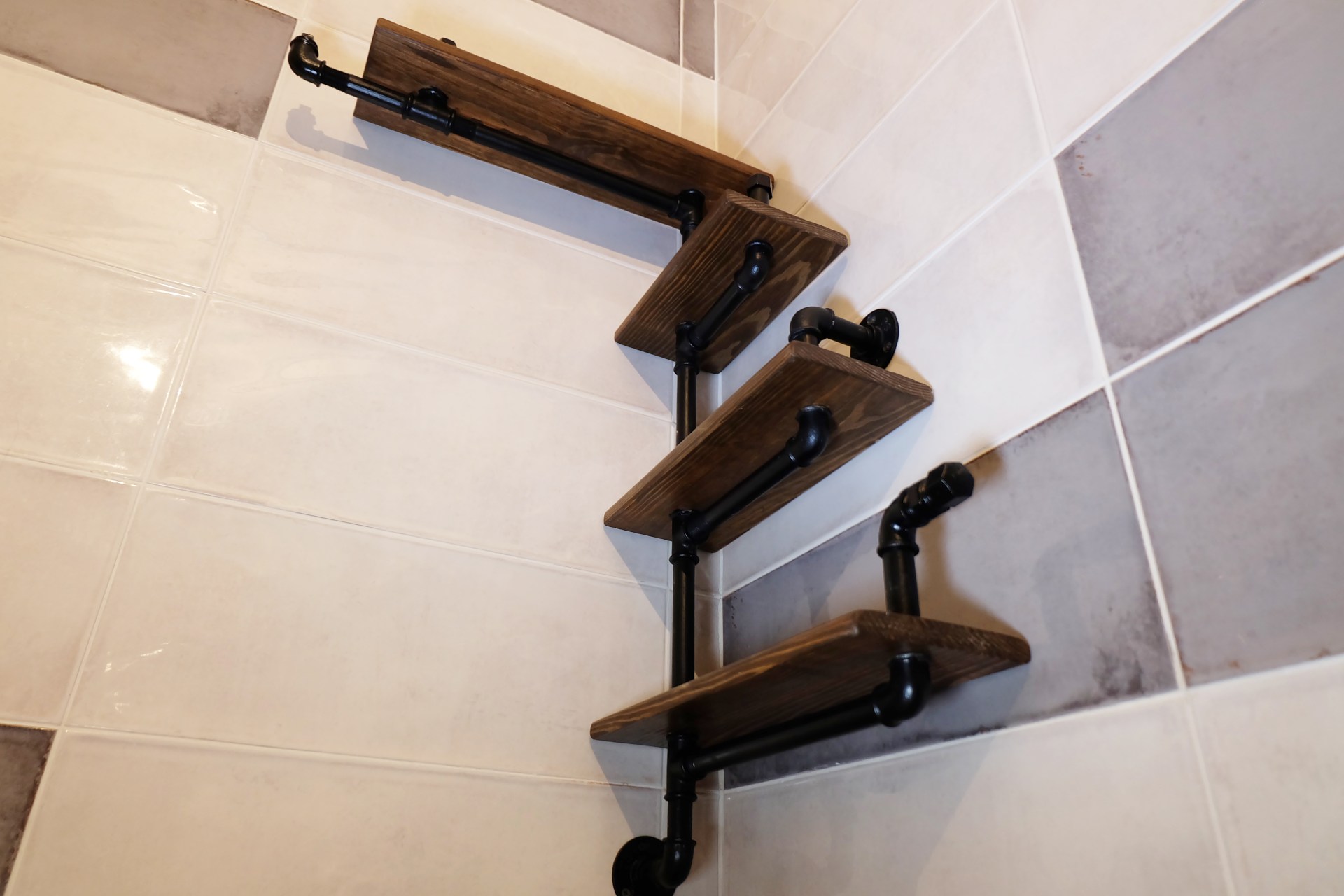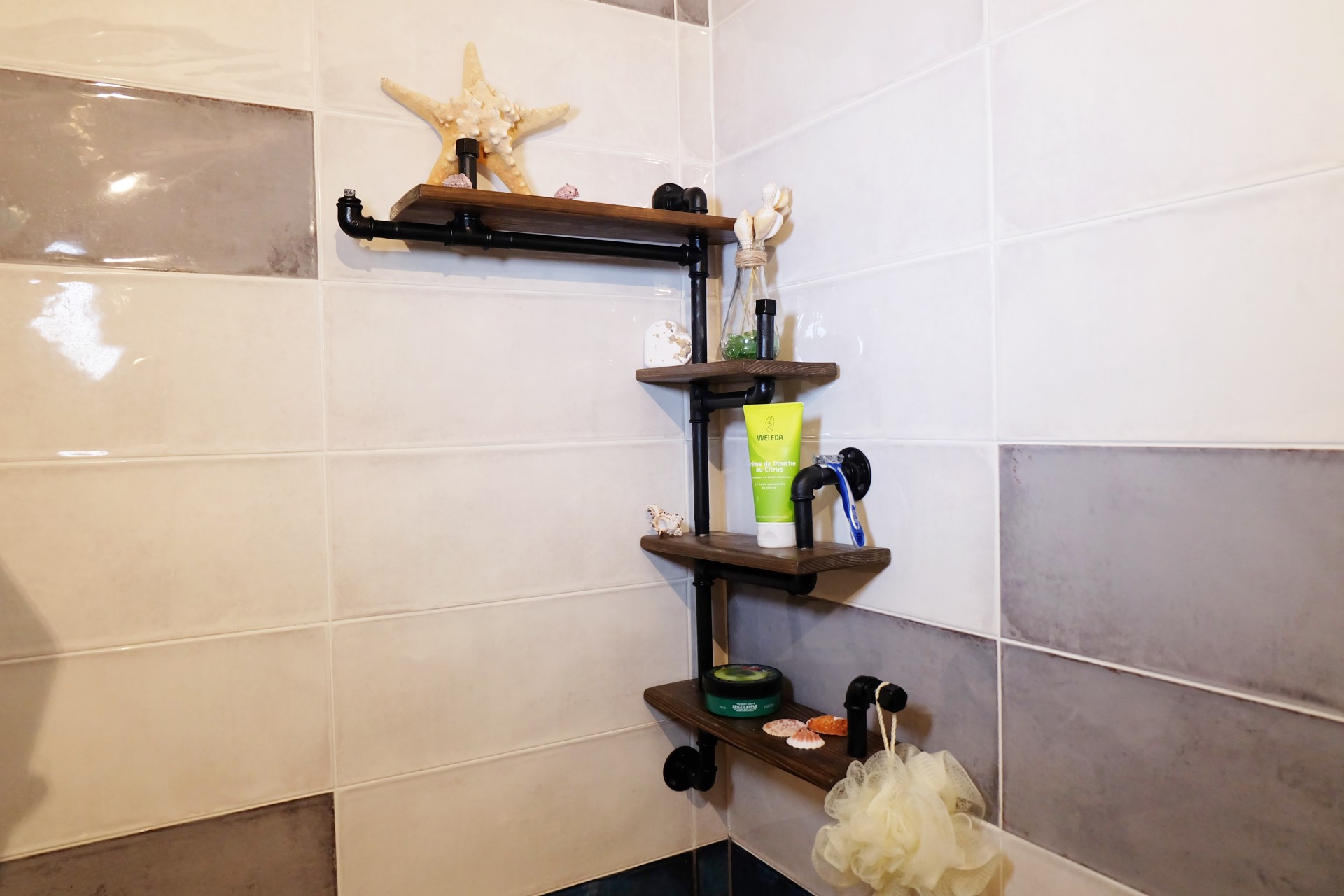 Дизайнерская угловая полка из массива и металлических труб в стиле Loft. Множество крючков позволит уместить максимально много аксессуаров для ванной. Рейлинг под каждой полкой. Рейлинг под нижней полкой можно приспособить для детской корзины игрушек. Угловая дизайнерская полка влагостойка. Дизайн разрабатывался под заказчика и прочно осел в нашем каталоге.